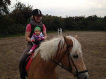 Ab und zu findet sie auch noch Zeit für unser Familienpferd Salli. Wenn ich Glück habe, darf ich auch mal mit drauf (oder wie ich zu sagen flege "darein").